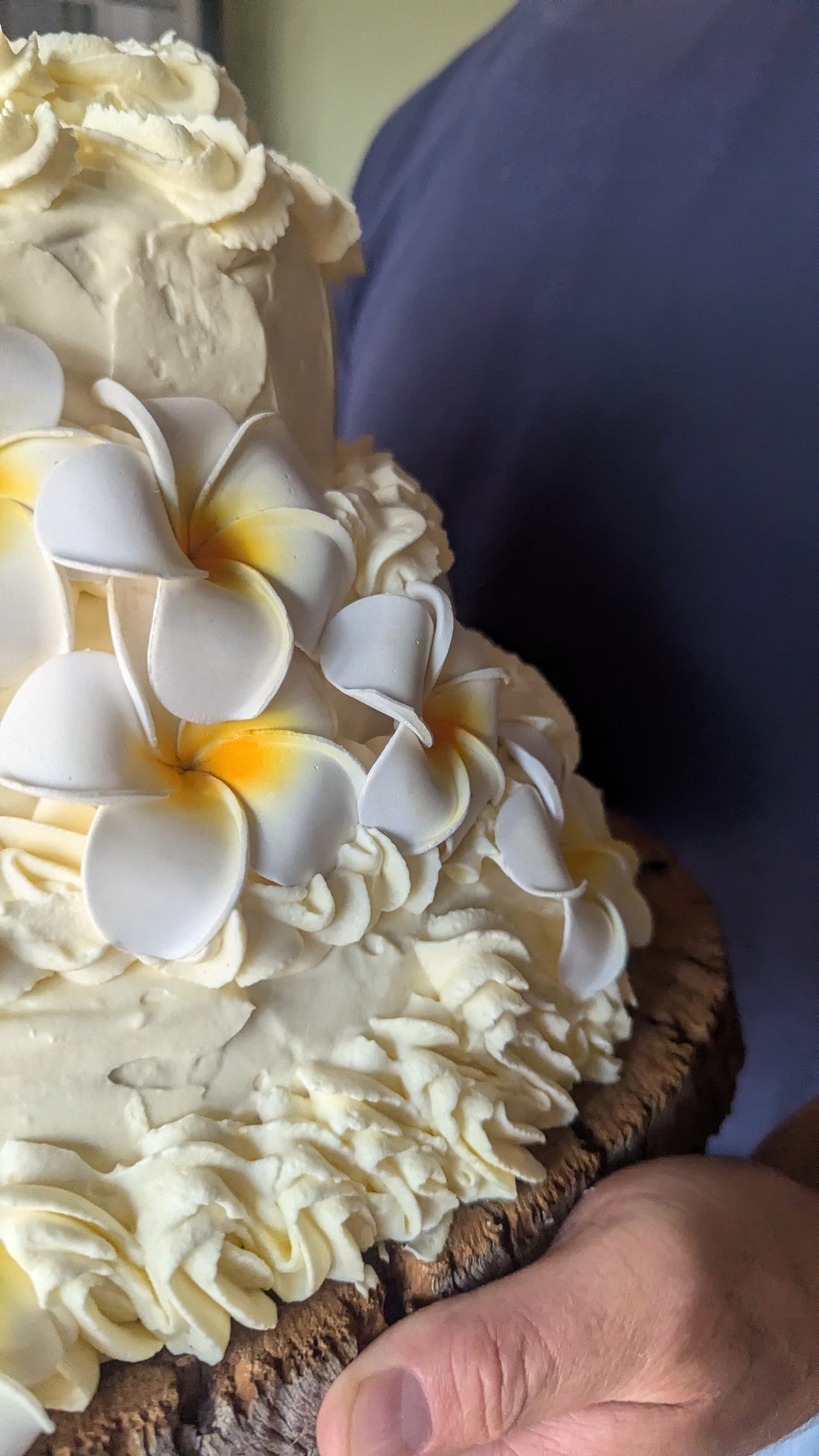 At a recent Bruderhof wedding I attended, very few of the non-Bruderhof guests brought gifts, and no community members appeared to be bringing the couple gifts – why is that? How do the couple get what they need for their new house? Because we live together in a community that strives to share everything in the spirit of the earliest churches, everything a couple needs for their new house will be provided for them. It won’t be a mansion, and the furniture and household goods in the house don’t belong to them per se, but they will have everything they need. Friends and family of the couple will often make a special gift to honor the occasion (sewing a dress, writing and performing a new song, painting a picture, making the wedding cake, etc.) but those will be given to the newlyweds during the celebrations prior to their wedding, or will be waiting in their new house. My gift to the couple was to make their wedding cake. I kept it simple and festive with whipped cream, frangipanis, and tiny cowboy boots and hats for the top. Chris carried it to the outdoor venue where – after the couple fed each other – it was enjoyed by everyone.