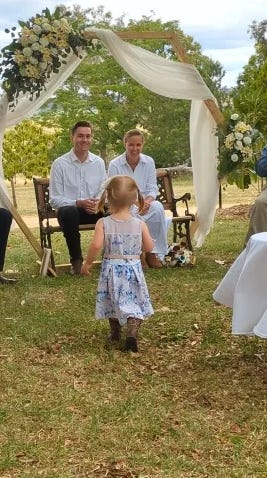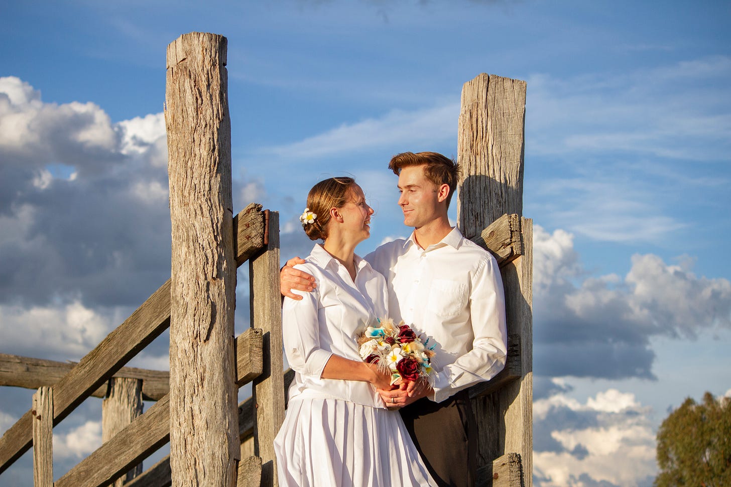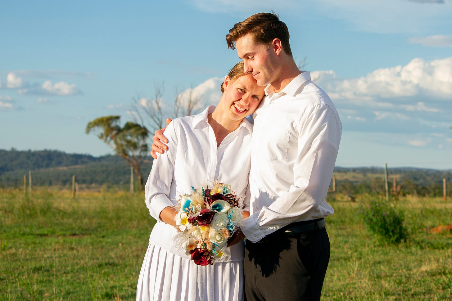 Is everywhere decorated with flowers? Yes, if they are available, but each wedding is different – simple and beautiful. Mostly, weddings are celebrated outside if the weather is kind (almost always here in Australia), which keeps the wedding decorating to a minimum. Who can beat a cathedral built from eucalyptus trees and floored with grass? A close friend of our family offered their ten blooming frangipani bushes to be plucked to decorate Jordan and Maddie’s special day – we could never have afforded that, and the simplicity and beauty of that gesture was amazing. (And we hardly made a dent in the blossoms!) All my wedding flowers – except the red roses that I carried – were wildflowers picked from fields on our community farm.