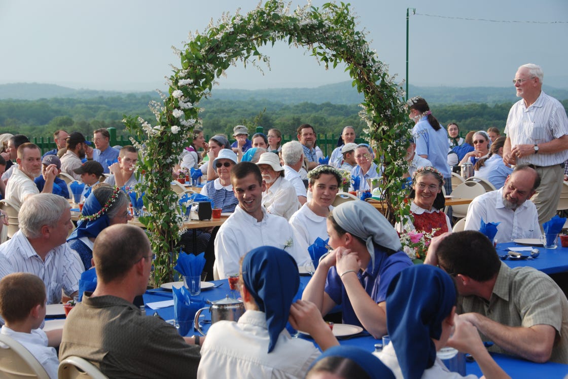 Is the wedding ceremony followed by a reception or dancing? No, because usually we have been feasting, singing, and celebrating together as a community for at least a week. All the components of a conventional mainstream wedding are broken up across a few days to take the pressure off and allow all of the community to celebrate and take in each event. For example, the cake cutting might be done with all the children present (from the tiniest babies on up), the “reception” is put on as a massive feast in the days right before the wedding, and a very special prayer and worship service just for the couple and community members is held usually the day before the wedding. The focus of that worship service is to pray for the couple in specific, and for all of us to rededicate our lives to God.